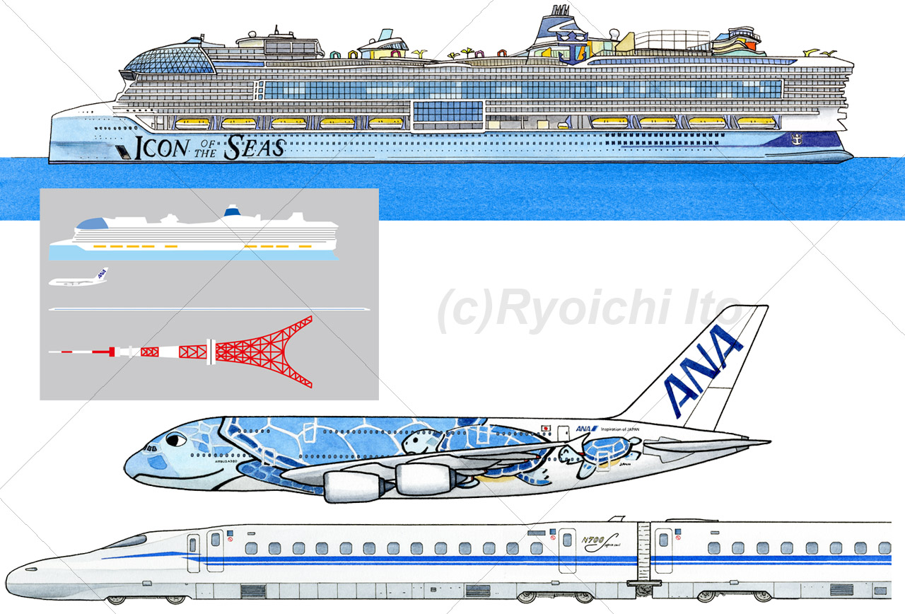 フレーベル館イラスト公開日:2025年9月22日お知らせ フレーベル館刊行「キンダーブック・がくしゅうおおぞら」11月号に乗り物イラストを描きました。新幹線、豪華客船、飛行機の乗客数比較のためのイラスト。真ん中左の小さい比較図はAdobe illustratorにて制作。 投稿ナビゲーションオリジナルイラスト「月とヤモリ」和菓子の帯紙用イラスト